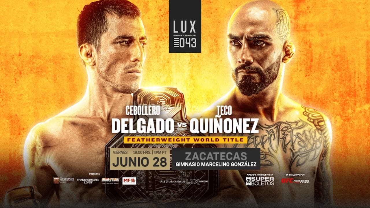 2024 / 0 hr 30 minLUX 043 was a mixed martial arts event that took place on Friday, June 28, 2024 the Marcelino Gonzalez Gymnasium in Zacatecas, Zacatecas, Mexico.