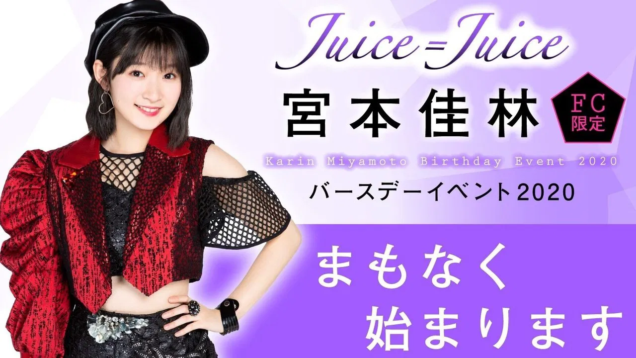 Juice=Juice Miyamoto Karin Birthday Event 2020 (Juice=Juice 宮本佳林バースデーイベント2020) is Miyamoto Karin's upcoming 22nd birthday event. Two shows took place on December 1, 2020 at Ota Ward Hall and Abrico Large Hall. The event is for fanclub members and a DVD will be released after the event. In compliance with government policy due to the coronavirus pandemic, cheering, crowding, standing, and closeness in the venue are prohibited, and wearing masks will be required to enter.[1] From December 5 to December 6, 2020, a recording of the event was digitally distributed to fanclub members who apply.[2] The deadline to pre-order the fanclub-exclusive DVD was on February 26, 2021, and it will be released to fanclub members in April 2021.