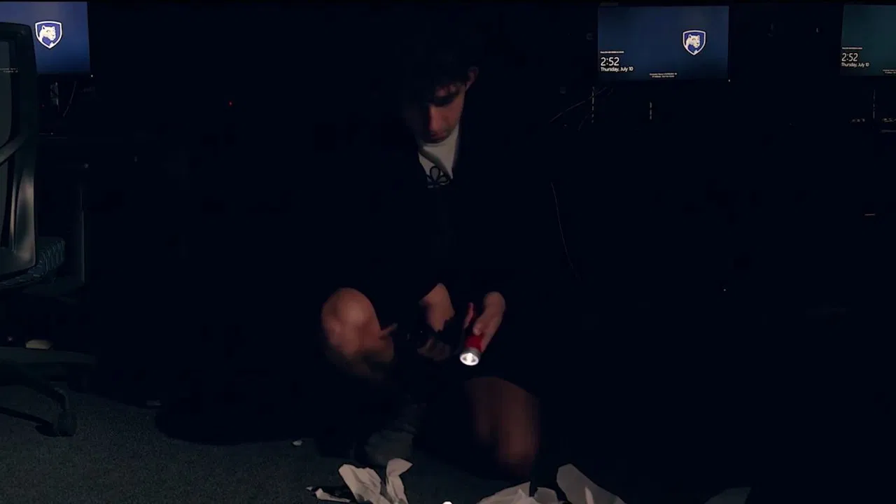 An agent that wears a suit and tie with shorts, must investigate a threat in the building.