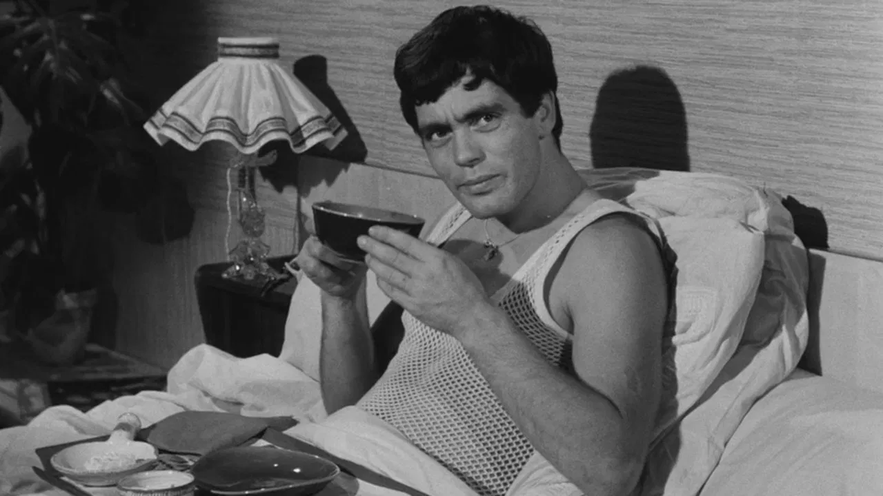 1963 / 1 hr 49 minIn a building close to the Place de la Contrescarpe in Paris, a tale of criss‑crossings in turn romantic, gourmet, interested or mystical, between an Italian gigolo and a nightclub hostess, a family of butchers and an apprentice rocker, a mystic tailor, a writer sending himself telegrams, an alert paralytic woman, a thoughtful concierge, a bird breeder and a just‑out‑of‑jail hooligan. Little by little each one discovers each other’s more or less troubled history… when a mysterious death introduces the Police within this huis clos, hastens disclosure of well‑kept secrets and ruffle this little World.